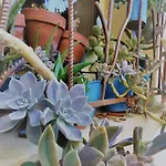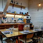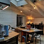 The kitchen amenities at the Lempdes sur Allagnon property feature a microwave oven, a refrigerator, and kitchenware, provided in a dining area.